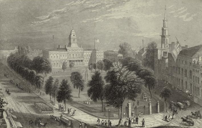 1822 - from south to north. On the left side the Broadway, on the right side Chatham Street (Park Row), in the middle the City Hall Park with the New York City Hall, at this point of time about ten years old. The Tower on the right belongs to "Brick Church". The large building on the right side (the sixth or seventh from total left) was the "Park Theatre", an early Manhattan theatre.